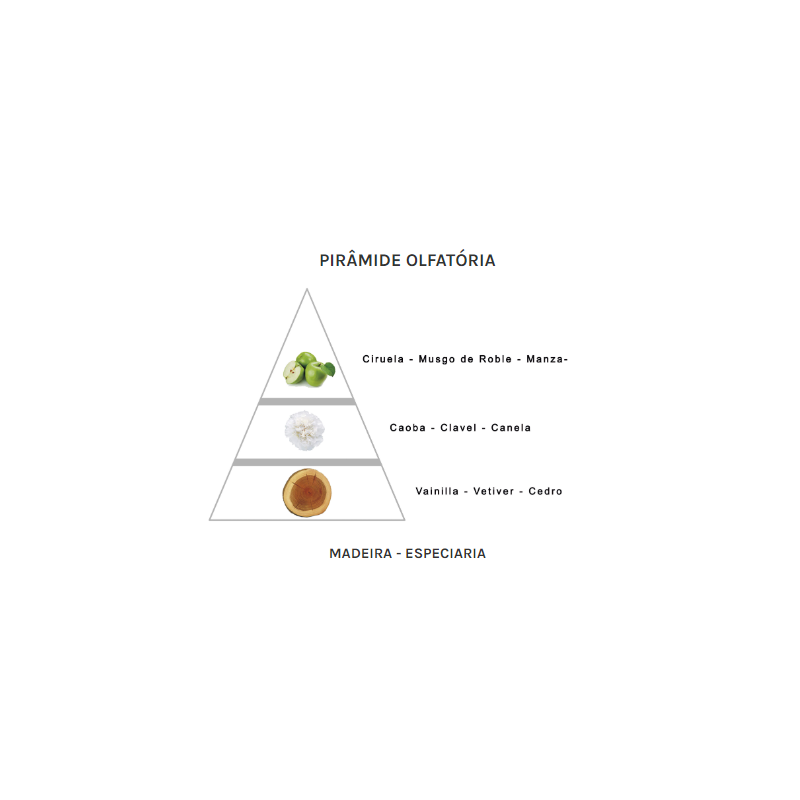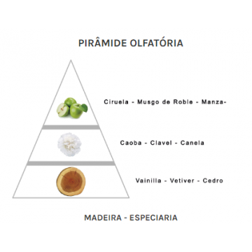 Les notes de sortida de poma i pruna li atorguen una frescor irresistible, mentre que les notes de cor de canyella, clavell i caoba li donen un toc picant i lleument dolç. Finalment, les notes de fons de fusta de cedre, vainilla i vetiver li aporten una profunditat i calidesa que envolten una aura elegant i masculina.