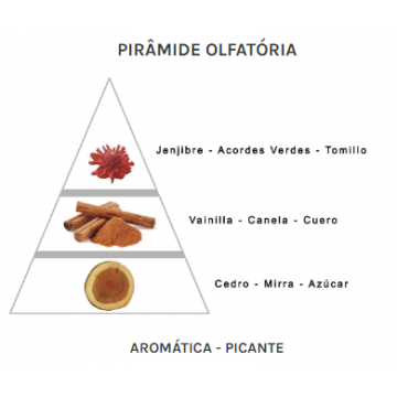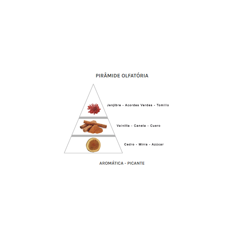 A fragrância abre com notas frescas de tomilho, gengibre e notas verdes, que se combinam com canela e baunilha, criando uma impressão inicial refrescante e revigorante. Além disso, é adicionado um acorde de couro que intensifica a masculinidade e a sensualidade da fragrância. Finalmente, a fragrância se acomoda em uma base rica e quente de cedro, sândalo, açúcar e mirra, trazendo uma sensação de profundidade e elegância à mistura.